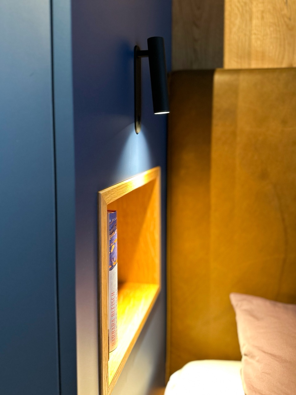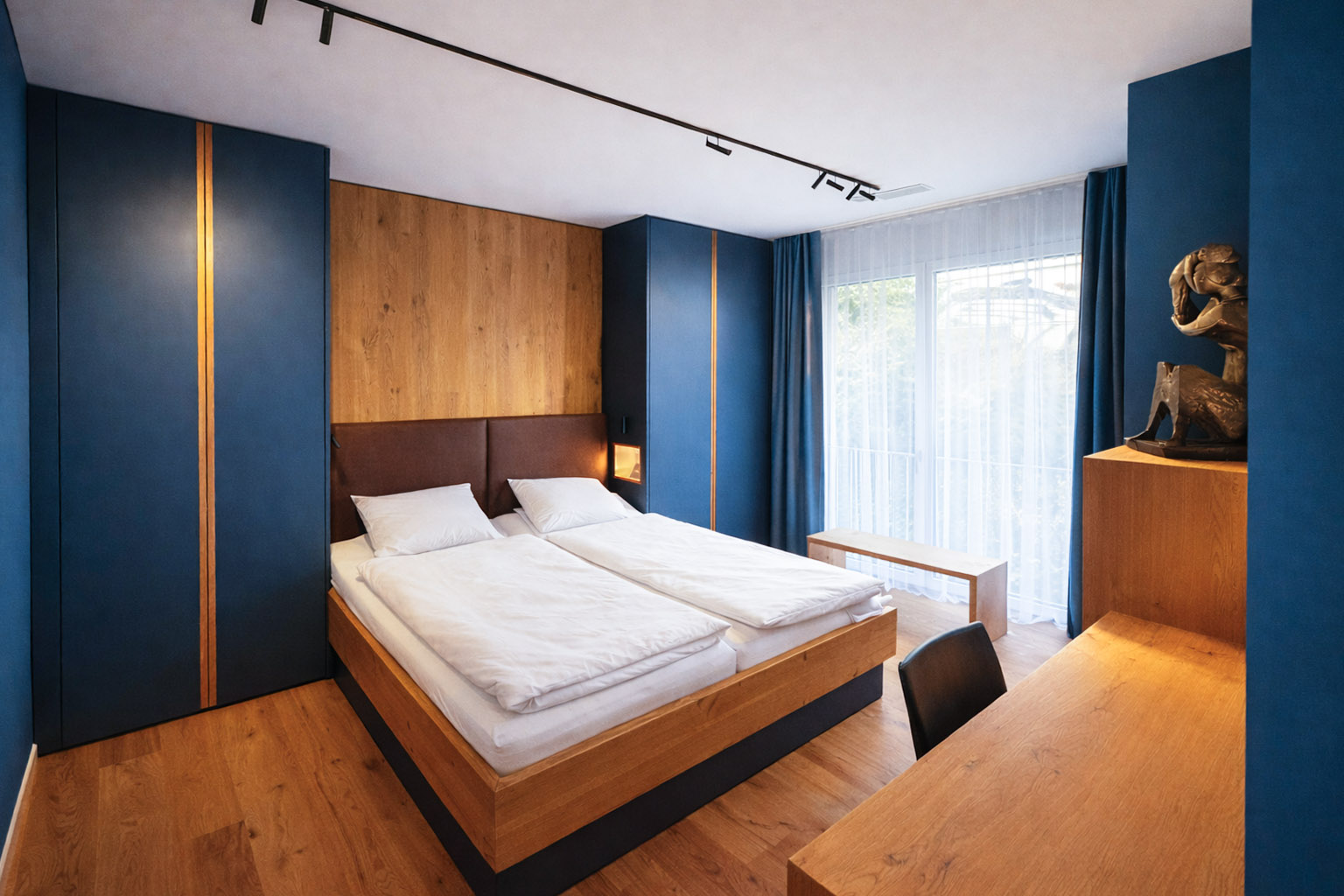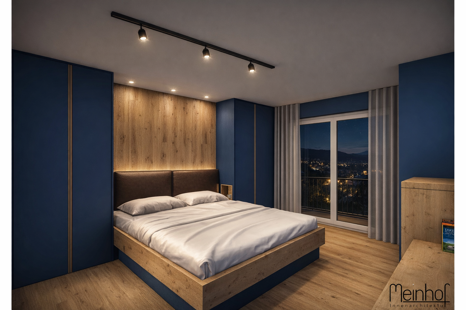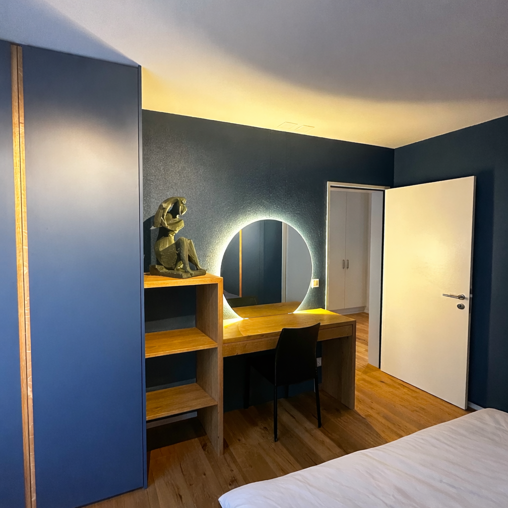 Das Innenarchitektur Konzept basiert auf der Ruhe und Klarheit eines Bergsees: ein Blauton dominiert, kombiniert mit natürlichen Materialien wie Holz und Leder. Fliessende Farbübergänge und matte Elemente greifen das Gefühl von Weite und Fläche des Wassers auf. Dezente Lichtakzente schaffen eine Atmosphäre der stillen Eleganz und Entschleunigung – wie ein Spaziergang am frühen Morgen am See.